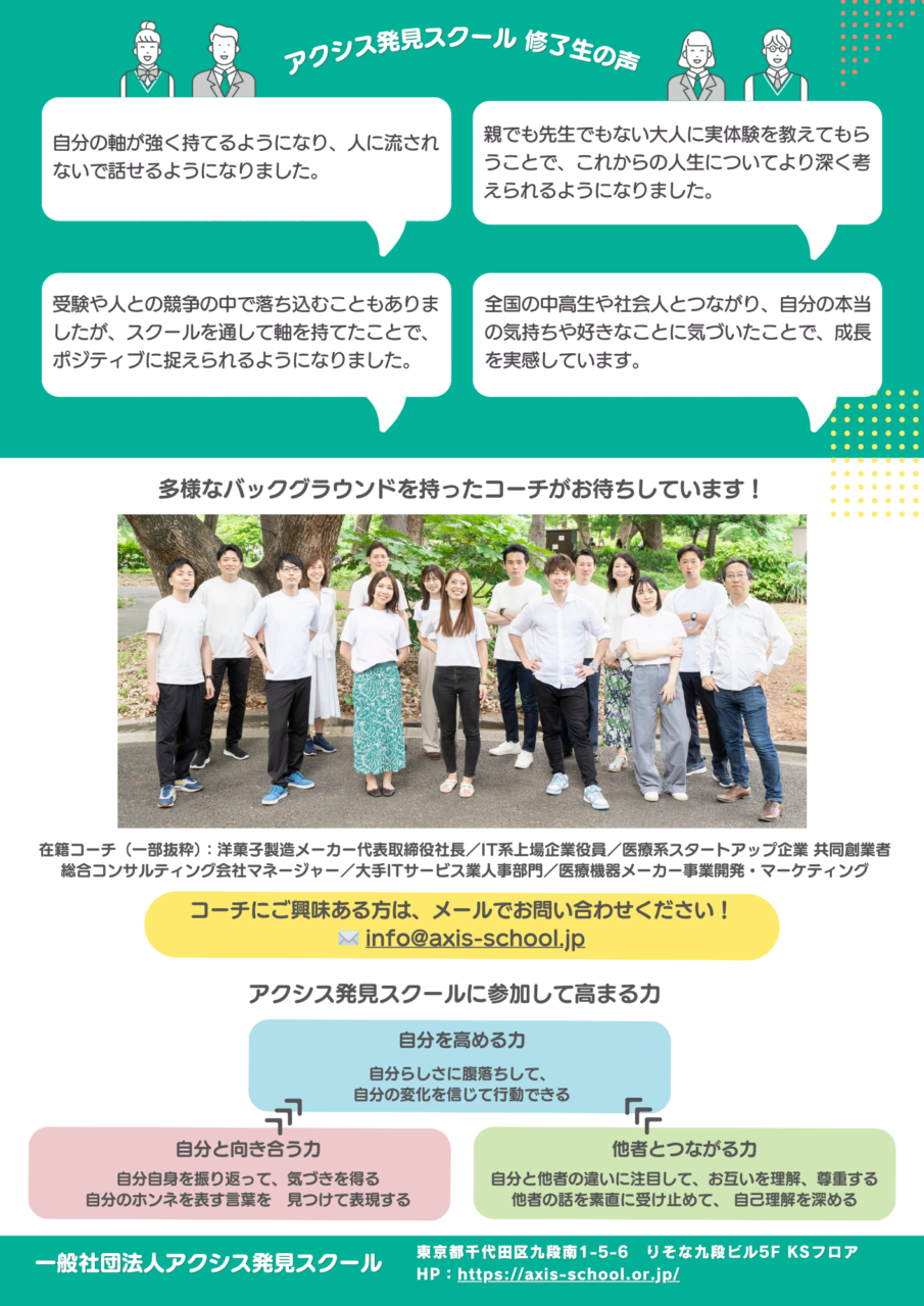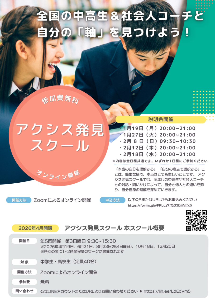 本スクールと呼ばれる年5回のオンラインスクールでは、学校や親とも違う第三者であり現役のビジネスの最前線で活躍する社会人コーチとの対話やワークを中心に、非認知能力を高め中高生が自身のアクシスを見つけるプログラムを無償で提供しています。